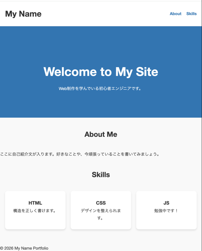 お疲れ様でした!これで、HTMLの骨組みからCSSのデザインまで、一通りの自己紹介サイトが完成しました。
